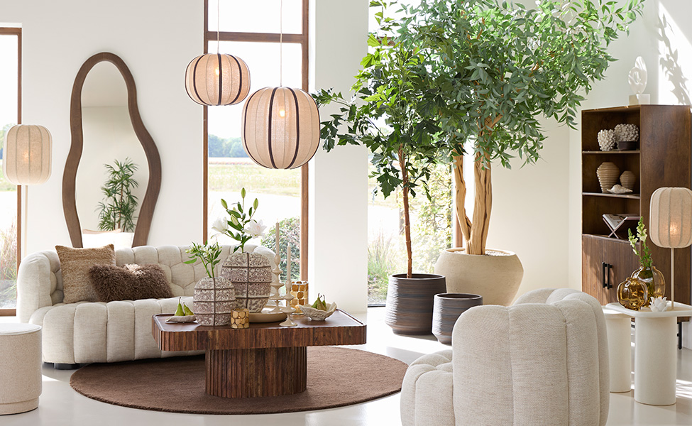 Wie houdt van een warme, natuurlijke sfeer kan Cloud Dancer combineren met aardetinten zoals zand, taupe en terracotta. Voeg materialen toe zoals hout, keramiek en rotan om een uitnodigend en harmonieus interieur te creëren.