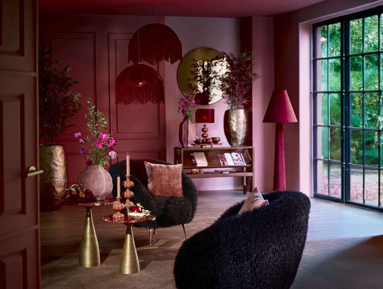 🛋️ Meubels en textiel – Combineer zachte stoffen in roze of rood met natuurlijke materialen zoals hout of rotan. Denk aan velvet stoelen, kussens of een warm vloerkleed.